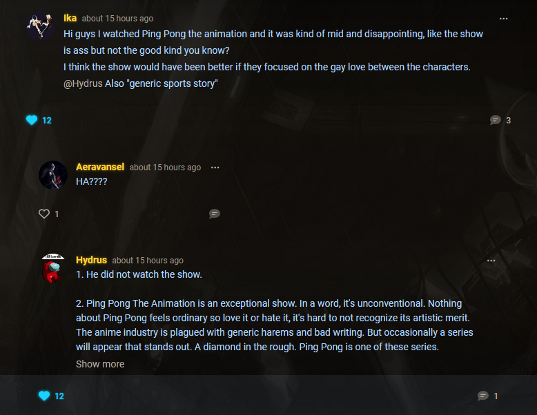 Hi guys I watched Ping Pong the animation and it was kind of mid and disappointing, like the show is ass but not the good kind you know?