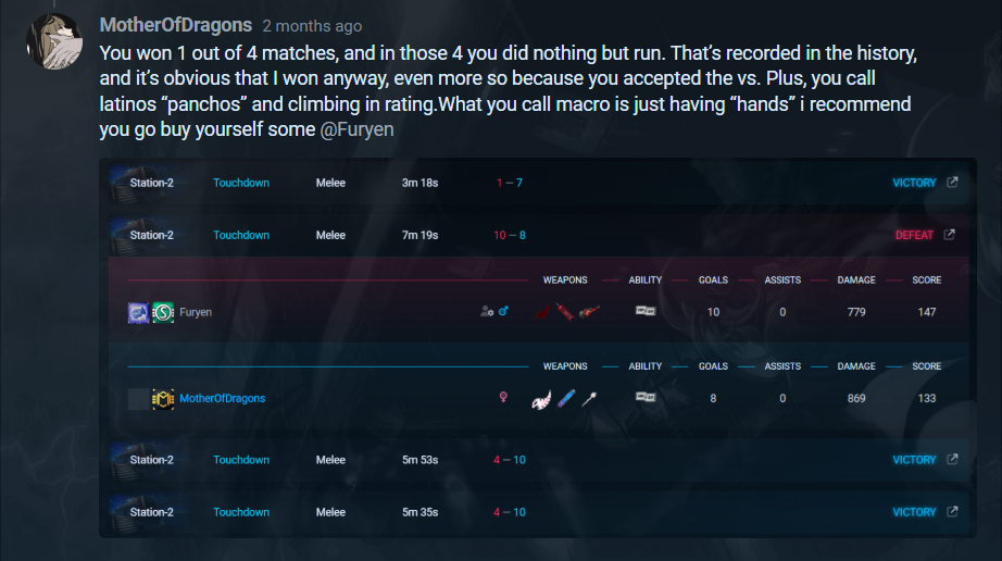 @Furyen Váyase a comer mierda y deje de joder a la gente. Si tengo que volver a pisarte la cabeza, lo haré. La primera y última vez te fuiste como cobarde, con el rabo entre las piernas, luego de que perdieras en 1v1. El registro de esas 4 partidas lo dice, aunque yo quería seguir subiendo de RT. Una pena que tuvieras que huir.