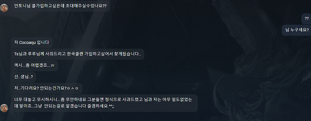 나한테 사과하고 내남친한테도 사과하고 근데 내남친은 용서안하긴햇지만 사과대충받아줫고 그러고나서 예전에 시비걸었던사람한테 클갑하고싶다고 징징 안받아줘서 화낫죠?